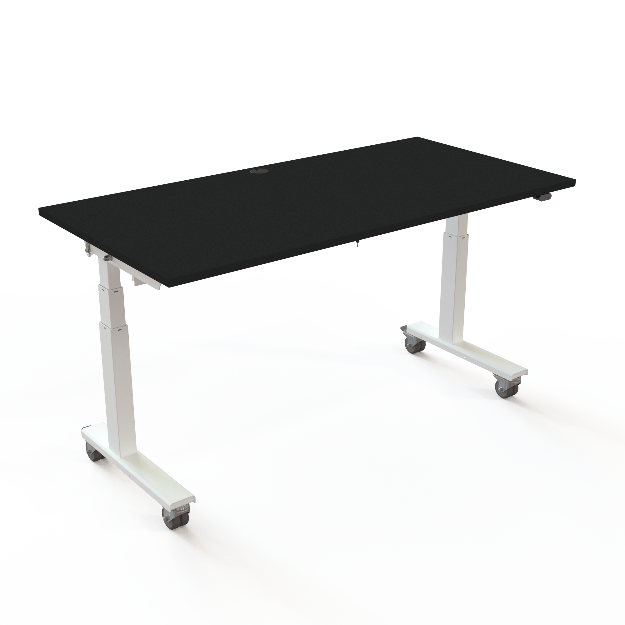 Straightforward design focusing on clean, rectangular aesthetics. Nesting table with special wheels for easy transport between rooms. Avoid cable clutter with a tray and rechargeable battery pack.